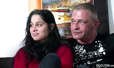 Fine and sensual brunette babe seduced and banged by two young and handsome men