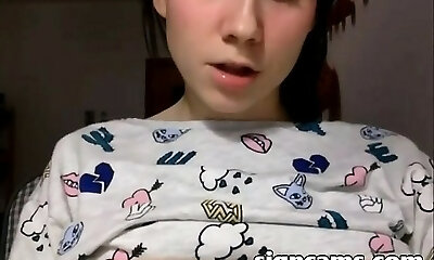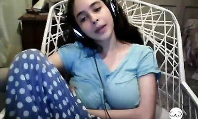 Nineteen year old busty webcam girl with innocent face touches her gigantic natural ti